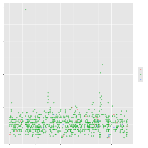 ggplot(data = variants, aes(x = POS, y = QUAL, color = sample_id)) +